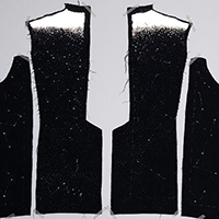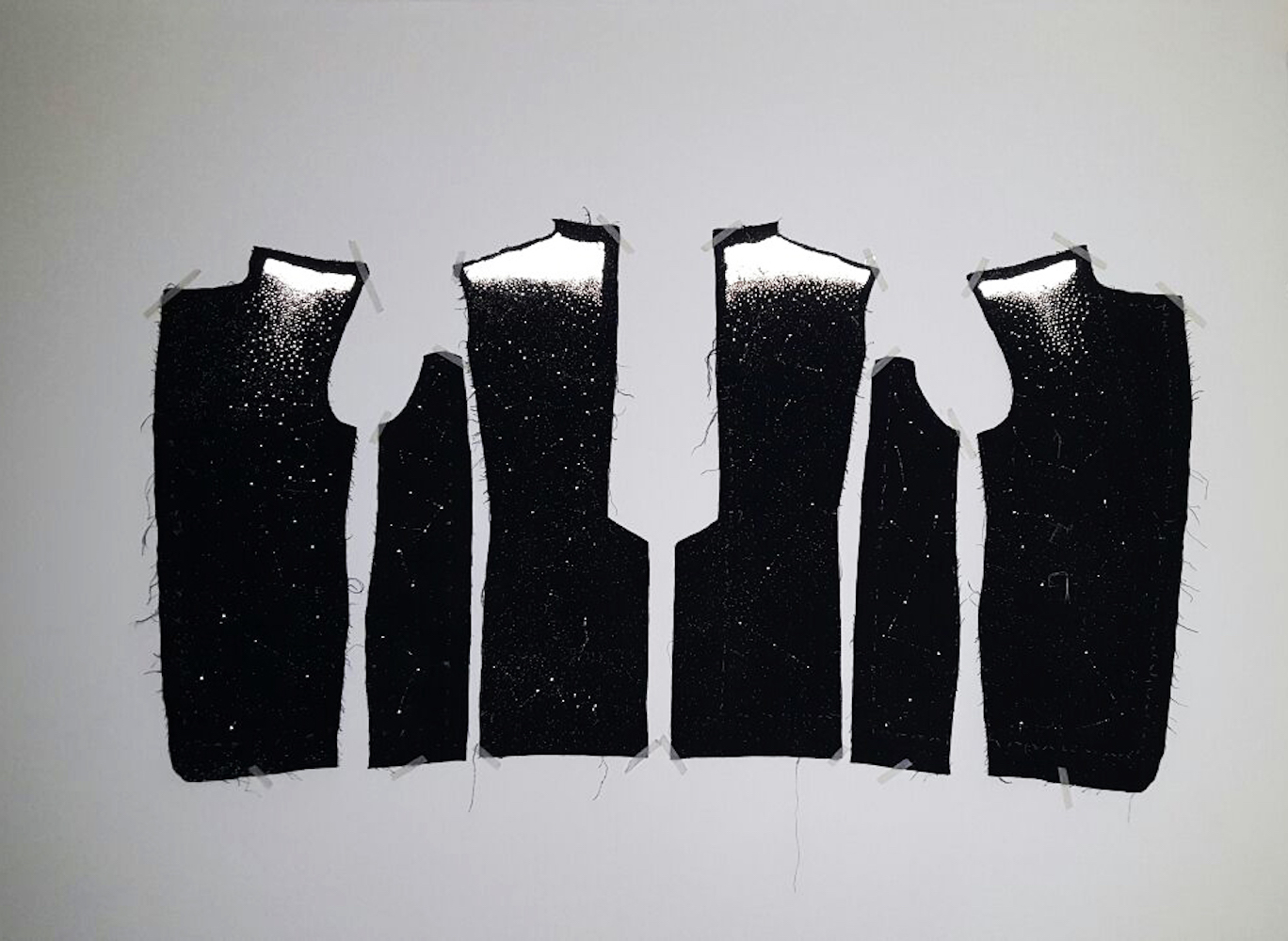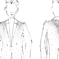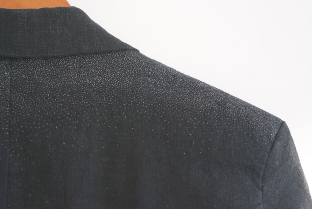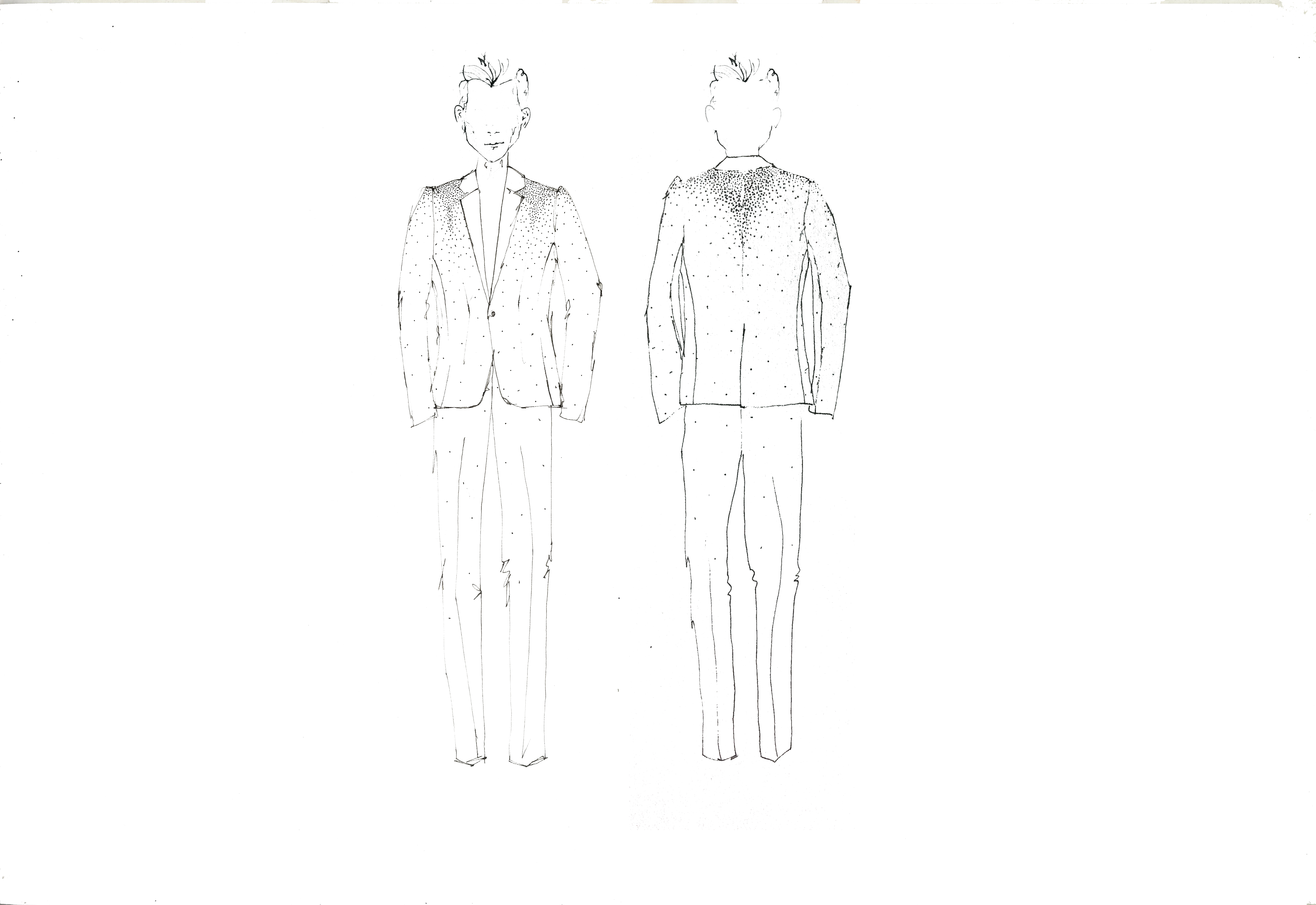 Inspired by the grainy yet sharp movement within John Batho's Présents & Absents — and his combination of a both dense and sparse texture — we proceeded to research ways of translating this onto fabric. After experimenting with hand and machine embellishing techniques, the truly bespoke technique of stab stitching was selected as the final method. This was applied in varying concentrations on different parts of the suit before construction.