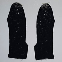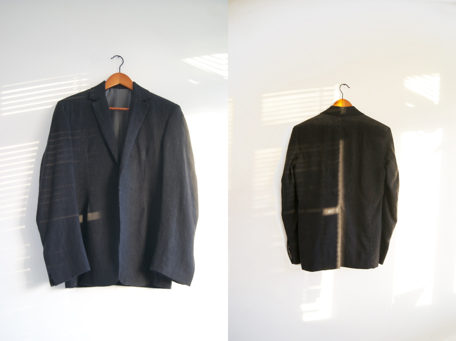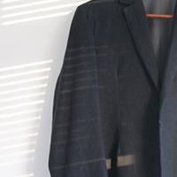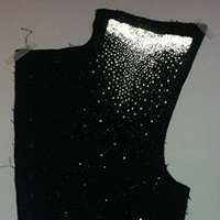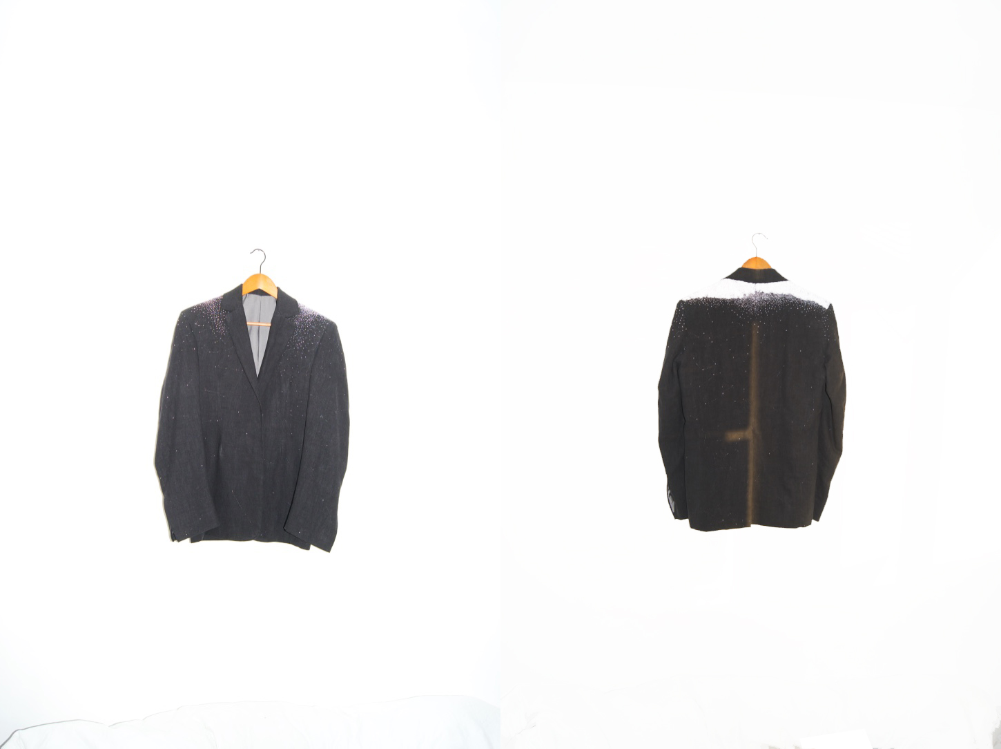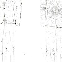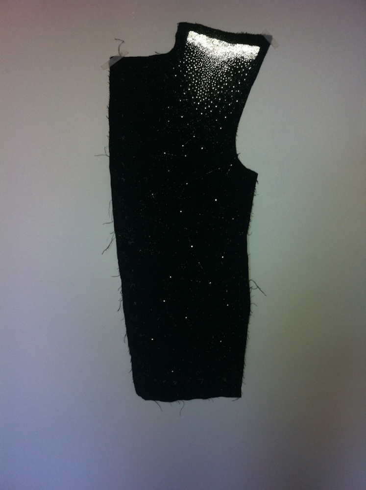 Inspired by the grainy yet sharp movement within John Batho's Présents & Absents — and his combination of a both dense and sparse texture — we proceeded to research ways of translating this onto fabric. After experimenting with hand and machine embellishing techniques, the truly bespoke technique of stab stitching was selected as the final method. This was applied in varying concentrations on different parts of the suit before construction.