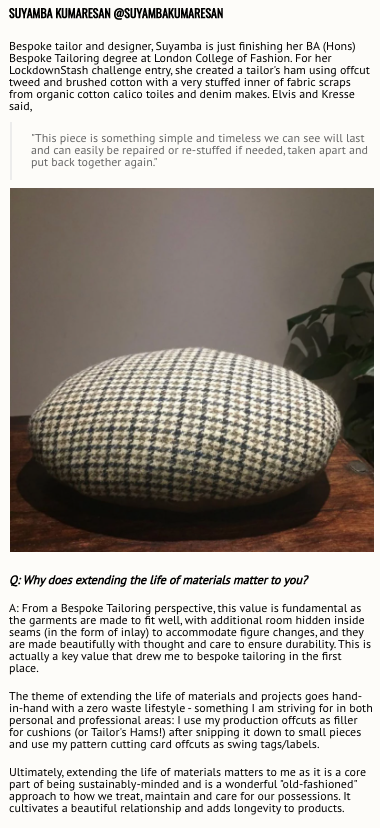 The lovely Offset Warehouse / Sustainable Fashion Collective asked about extending the life of materials and objects as part of a competition they ran. Have a read of the whole post here or have a look at a small sample of it here!